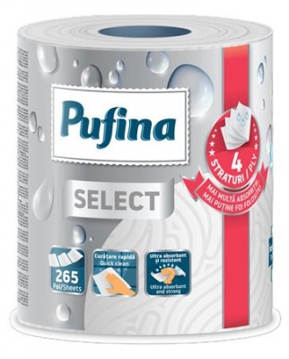 Háztartási papírtörlő, 4 rétegű, 265 lap, 1 tekercses, PUFINA "Select", hófehér