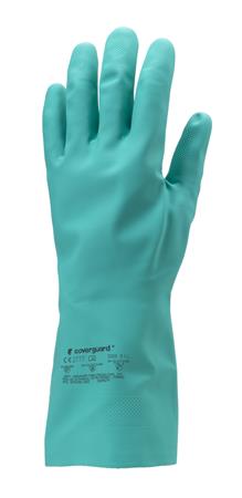 Védőkesztyű mikroorganizmusok elleni védelemel. -anyaga: zöld akrilonitril-pamutbolyhozott belső-sav-, lúg-, olaj-, zsír-, és vegyszerálló-csúszás ellen érdesített tenyér-0,38 mm vastag-hosszúság: 32 cm-CE minősítés-méret: 8/M